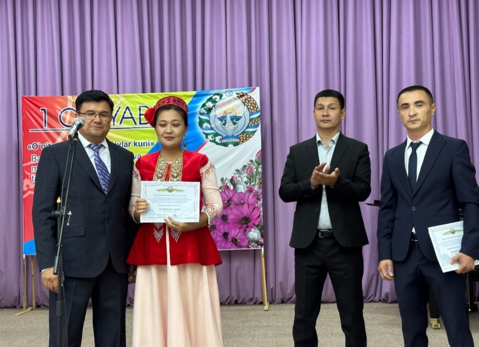 Usı jıldıń 28-sentyabr kúni mektep-internatı koncert zalında “1-oktyabr Oqıtıwshı hám Ustazlar kúni” bayramı múnásebeti menen ótkerilgen ilájdan qısqasha kórinis. Mektep-internatı málimleme orayı 2024.