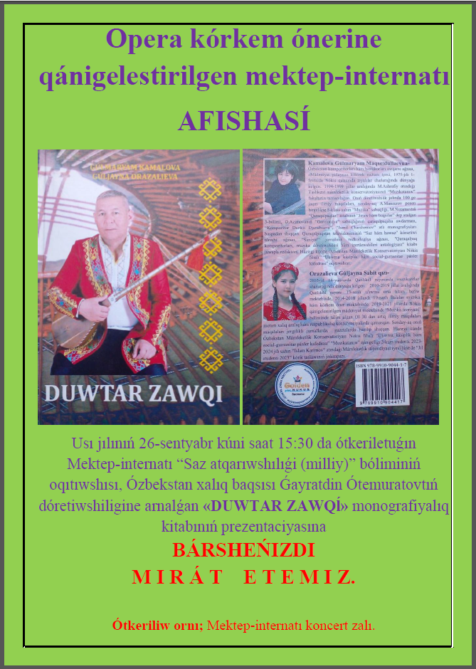 26-сентября текущего года в 15:30 концертном зале школы интернета состоится презентации монографически книги «Дутар зауки» Г. Утемуратова
