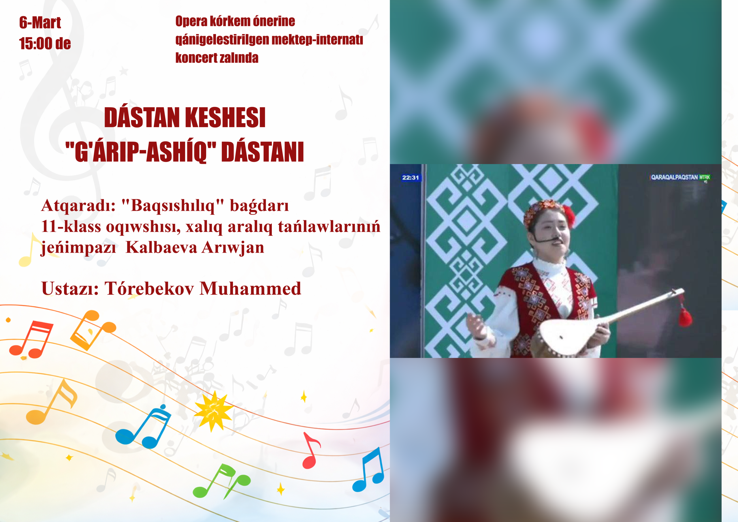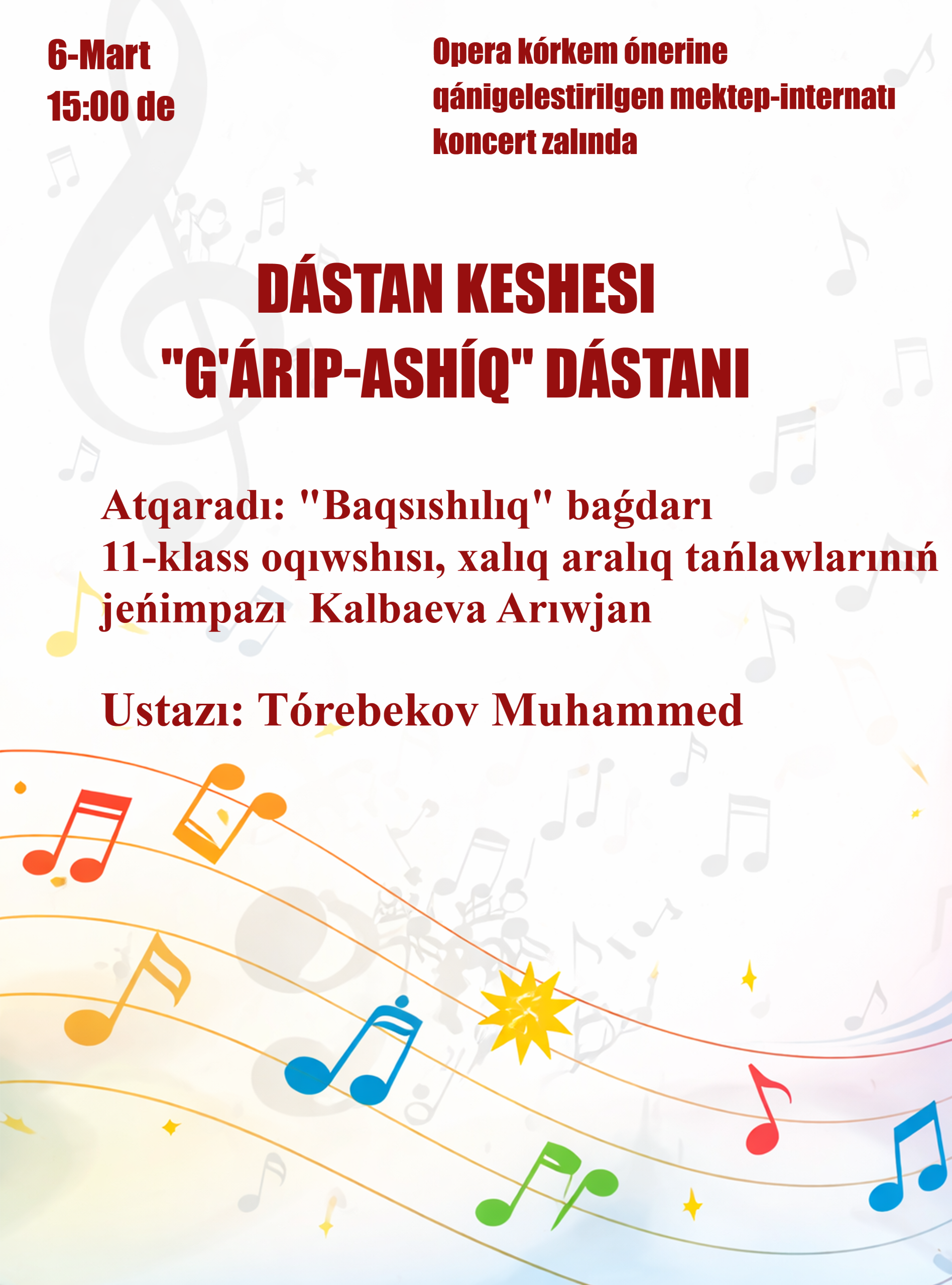 OPERA KÓRKEM ÓNERINE QÁNIGELESTIRILGEN MEKTEP-INTERNATÍ AFISHASÍ. Usı jıldıń 6-mart kúni saat 15:00de mektep-internatı koncert zalında ótkeriletuǵın «Dástan keshesi»ne BÁRSHENI MIRÁT ETEMIZ! —————————- Joriy yilning 6-mart kuni soat 15:00da maktab-internati konsert zalida o’tkaziladigan «Doston kechasi»ga BARCHANI TAKLIF ETAMIZ! Mektep-internatı málimleme orayı 2026 jıl.