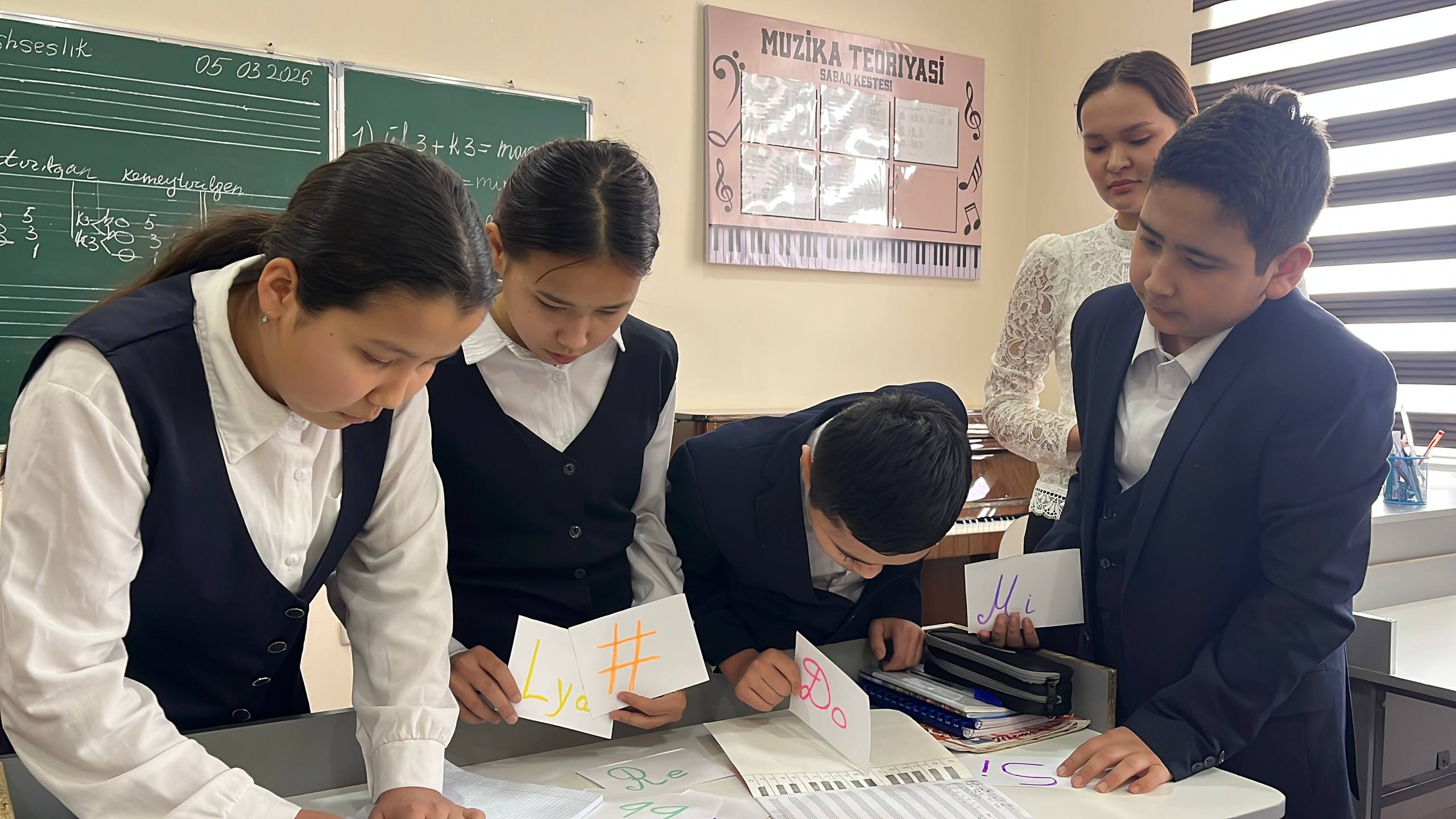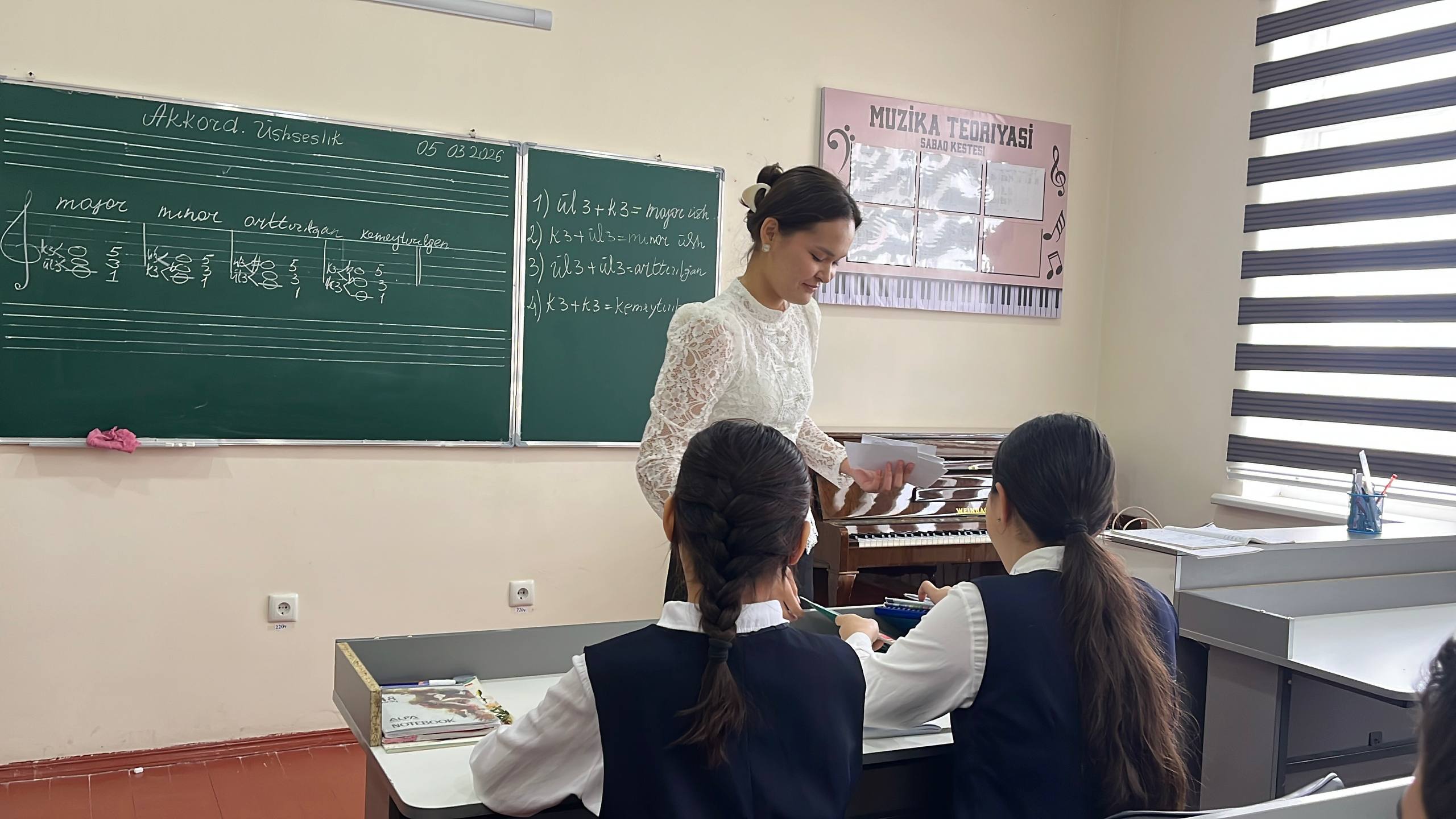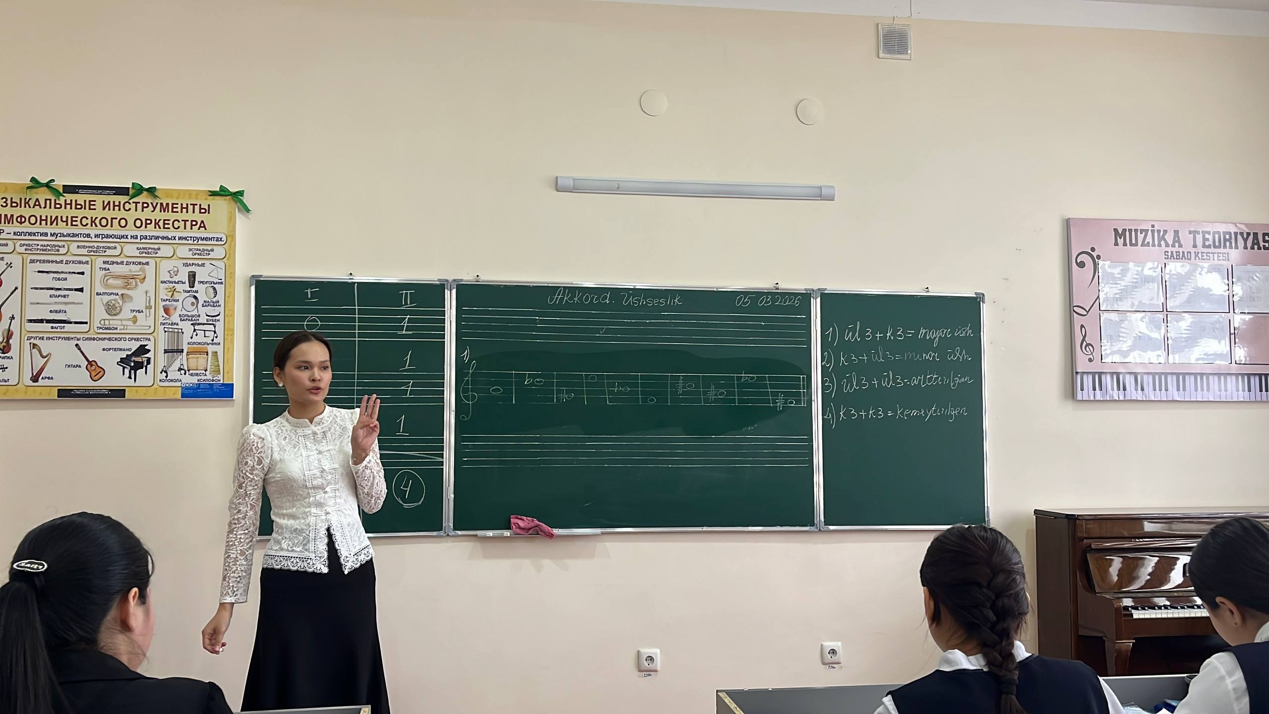 OPERA KÓRKEM ÓNERINE QÁNIGELESTIRILGEN MEKTEP-INTERNATÍ. Usı jıldıń 5-mart kúni mektep-internatı muzıka teoriyası páni oqıtıwshısı Gúlxumar Dawletbaeva tárepinen 8-klass (B-toparı) oqıwshılarına «Akkord (úshseslik)» temasında ótkerilgen «Ashıq sabaǵı»nan kórinis. ———————————— Joriy yilning 5-mart kuni maktab-internati musiqa nazariyasi fani o’qituvchisi Gulxumar Dauletbaeva tomonidan 8-sinf (B-guruhi) oʻquvchilariga «Akkord (uchtovushlik)» mavzusida o’tkazilgan «Ochiq darsi»dan lavha. Mektep-internatı málimleme xızmeti orayı 2026-jıl.