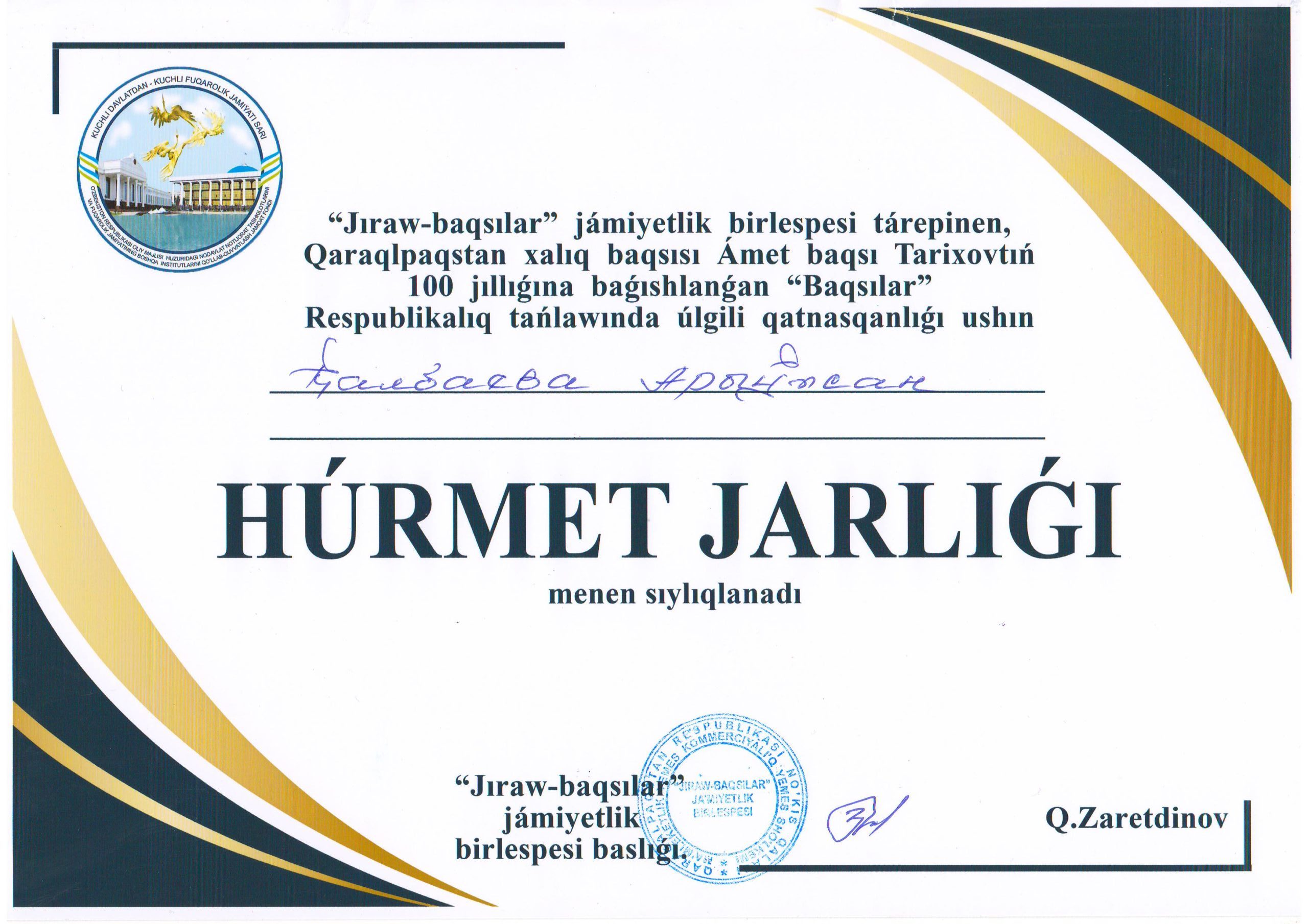 Обладательница почетной грамотой Калбаева Аружан, ученица 8 класса. Республикански конкурс общественного объединение ЖЫРАУ-БАКСЫЛАР Республики Каракалпакстана, посвященная 100-летию баксы Амета Тарихова.