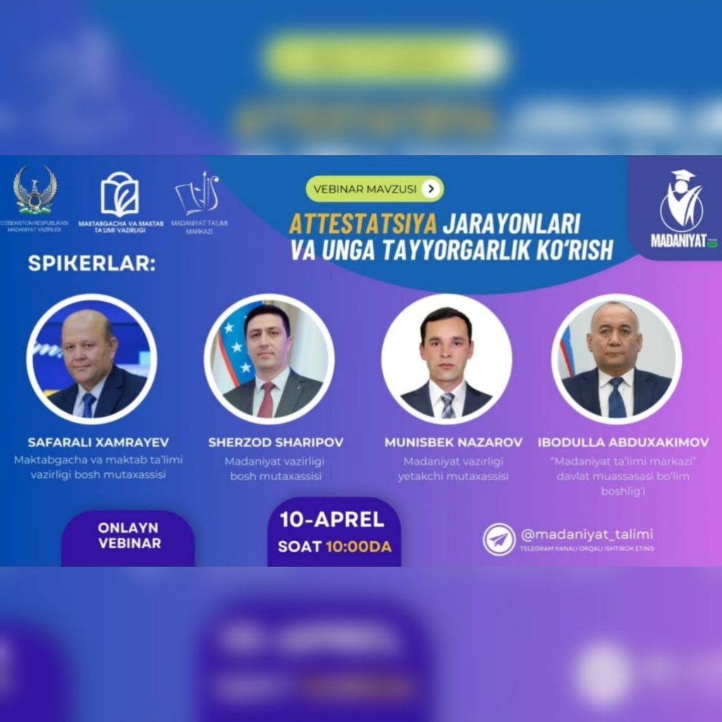 2025-yilning 10-aprel kuni soat 10:00da «Attestatsiya jarayonlari va unga tayyorgarlik ko‘rish» mavzusida onlayn vebinar o‘tkaziladi. Shu munosabat bilan maktab-internati ixtisoslik fanlari o’qituvchi va konsertmeysterlari qatnashmoqdalar.
