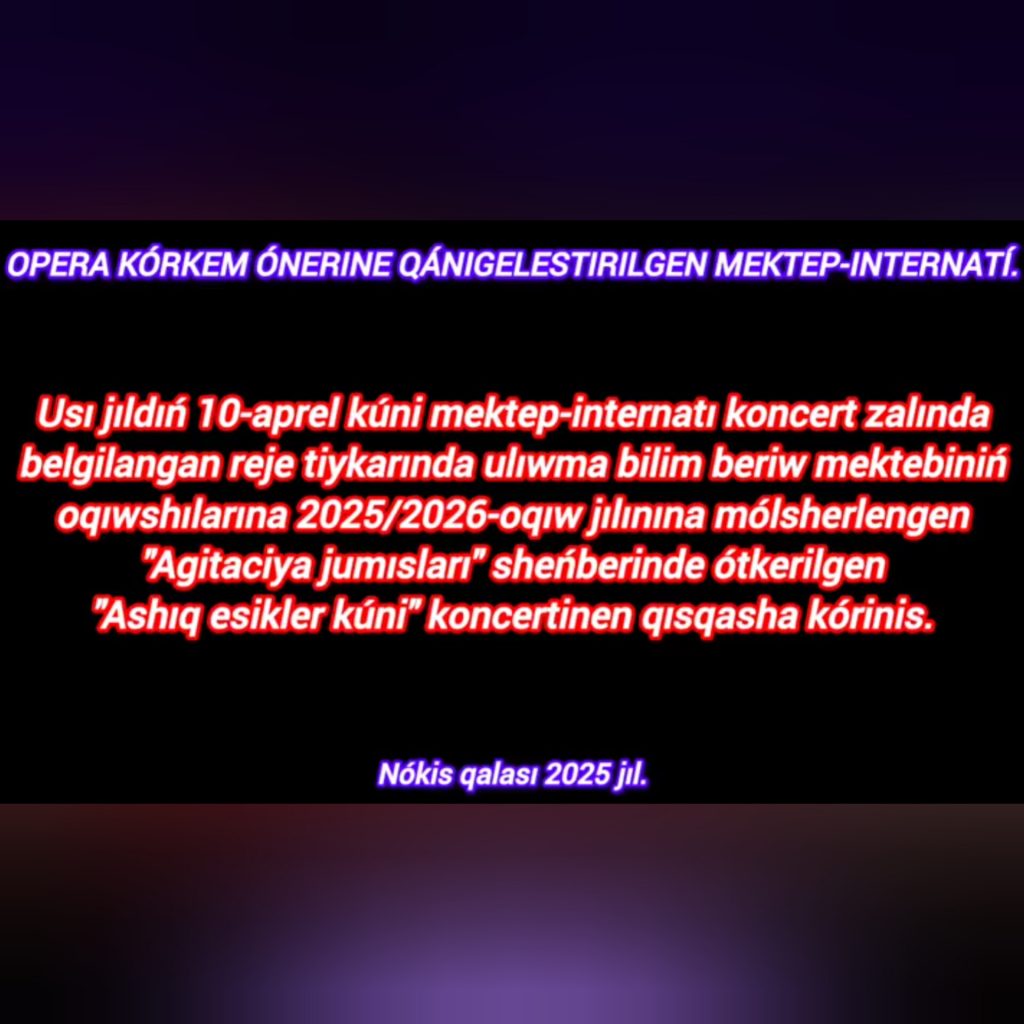 Oʻzbekiston Respublikasi Madaniyat vazirligi Hayʼat yigʻilishining 2025-yil 22-yanvardagi 2-son(XDFU) bayoni 2-ilovasi 56-bandida hududlardagi bolalar musiqa va ixtisoslashtirilgan madaniyat va sanʼat maktablarining 2025/2026-oʻquv yiliga moʻljallangan targʻibot tadbirlari doirasida umumtaʼlim maktablari oʻquvchilari uchun konsert dasturlari va «Ochiq eshiklar kuni» tadbirlarini oʻtkazich rejasiga muvofiq Opera sanʼatiga ixtisoslashtirilgan maktab-internati tomonidan tuzilgan rejaga asos joriy yilning 10-aprel kuni Nukus shahridagi 28-sonli umumtaʼlim maktab oʻquvchilari «Ochiq eshiklar kuni» tadbiriga taklif qilindi.